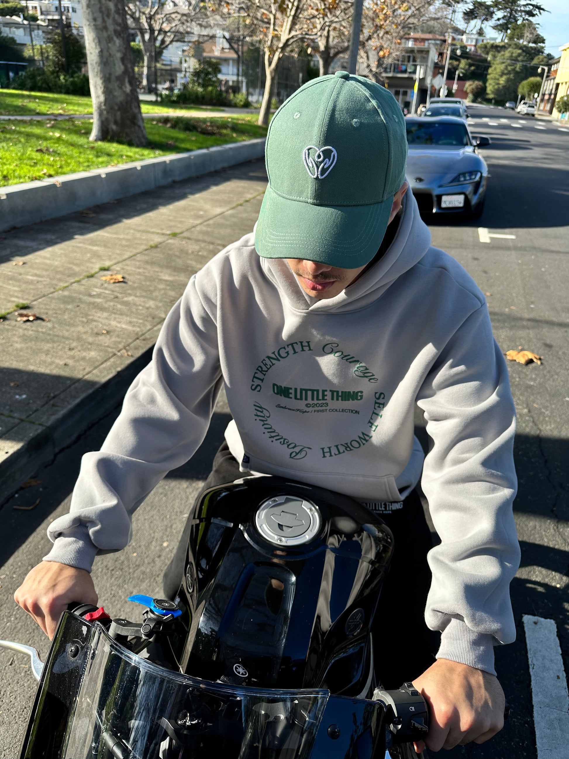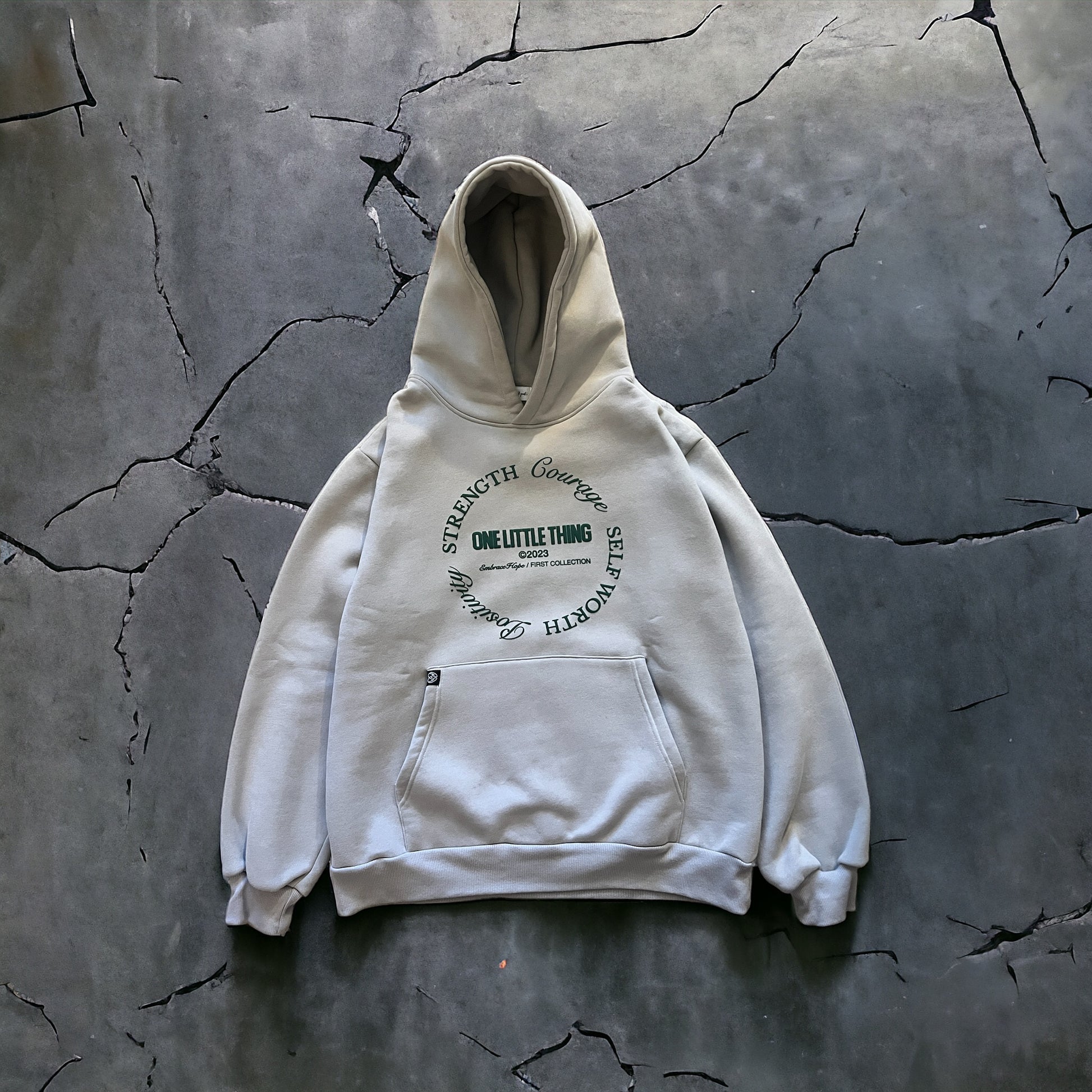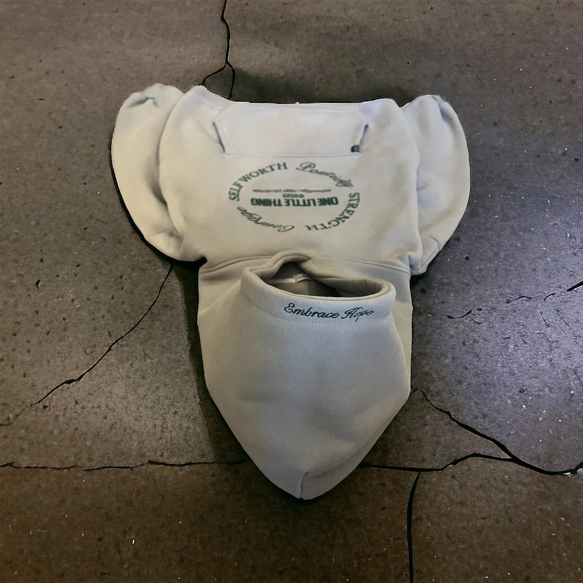 Introducing our Grey Strength Hoodie, a symbol of empowerment and positivity. This hoodie features a distinctive green puff logo on the chest, encircling powerful messages of strength, courage, self-worth, and endless possibilities. The back hood is adorned with delicate embroidery that encourages wearers to "Embrace Hope."