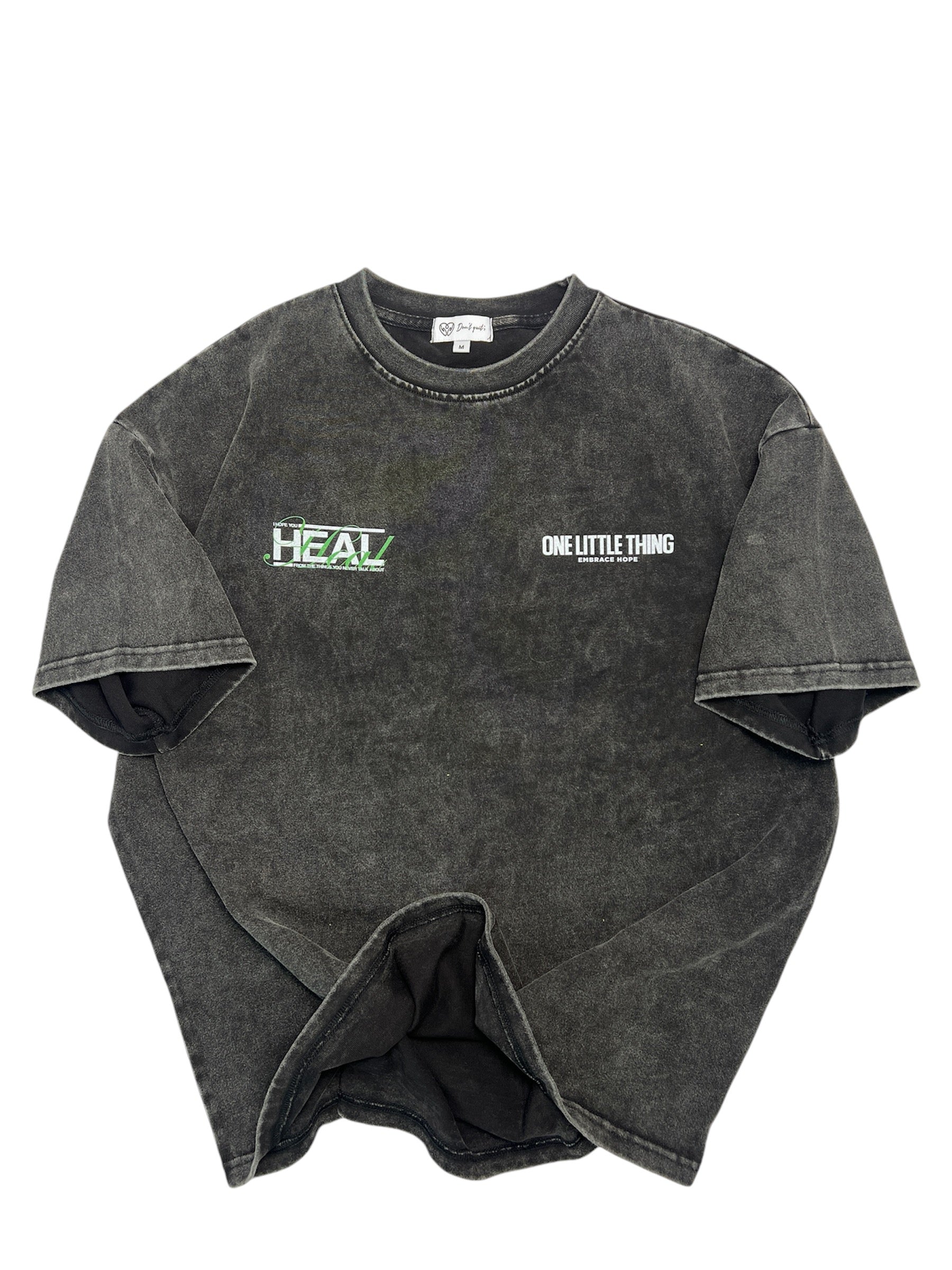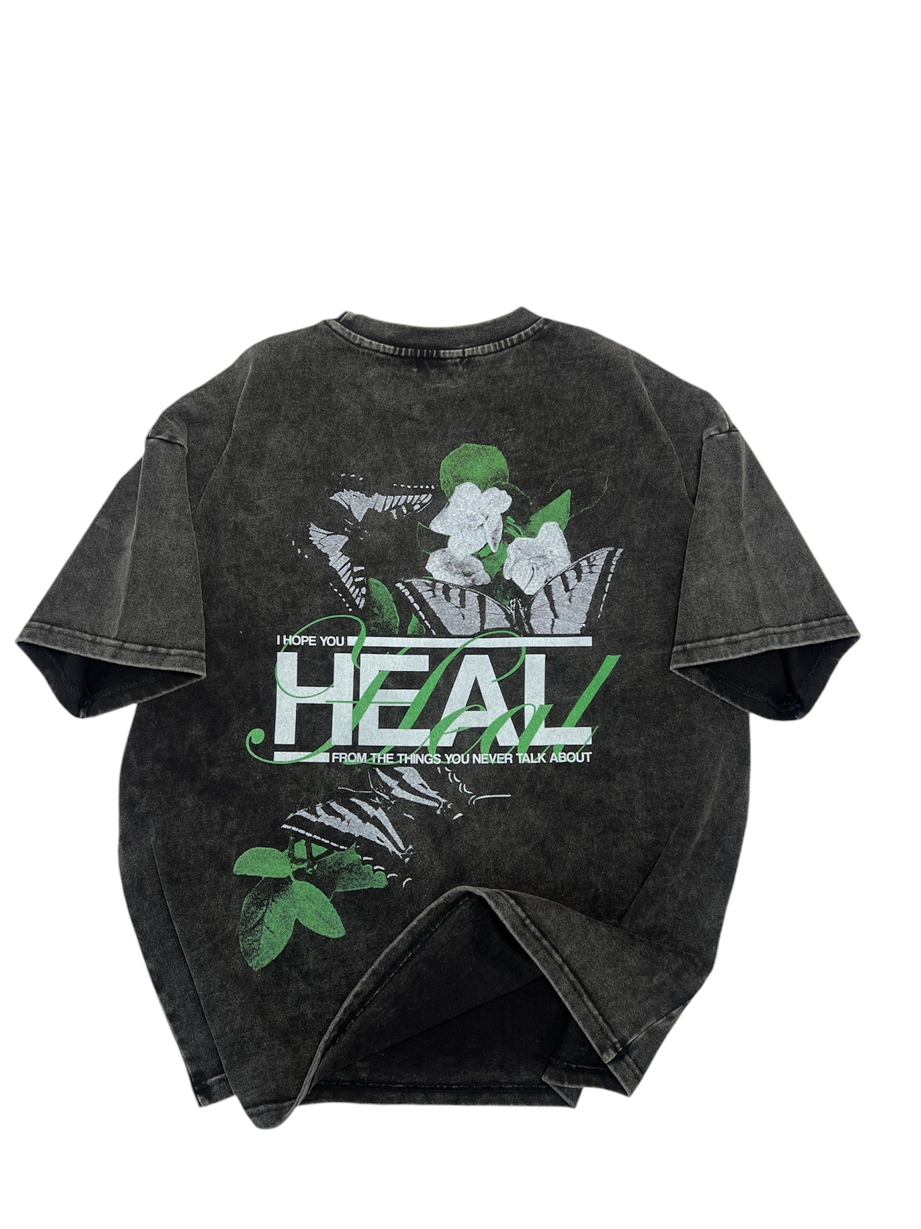 Introducing our washed black T-shirt, "I hope you Heal from the things you never talk about." Featuring bold typography and a graphic design of butterflies symbolizing growth and flowers representing healing through pain, this piece reflects strength and resilience.